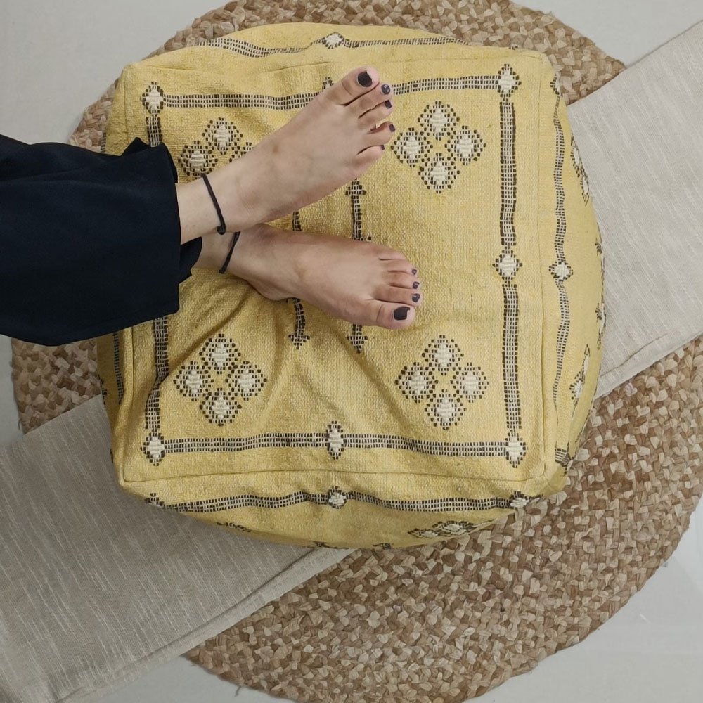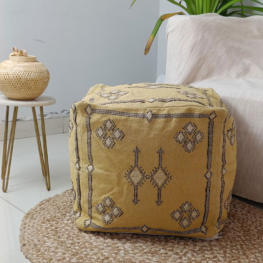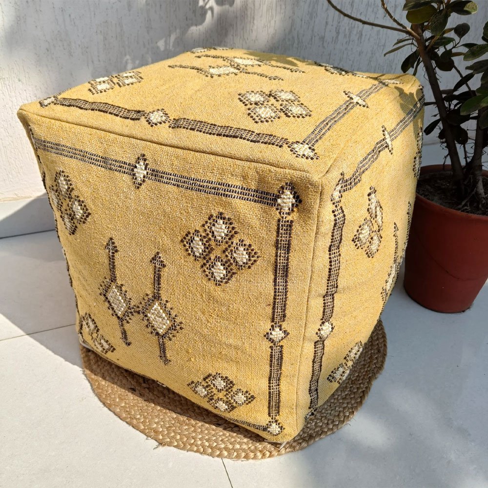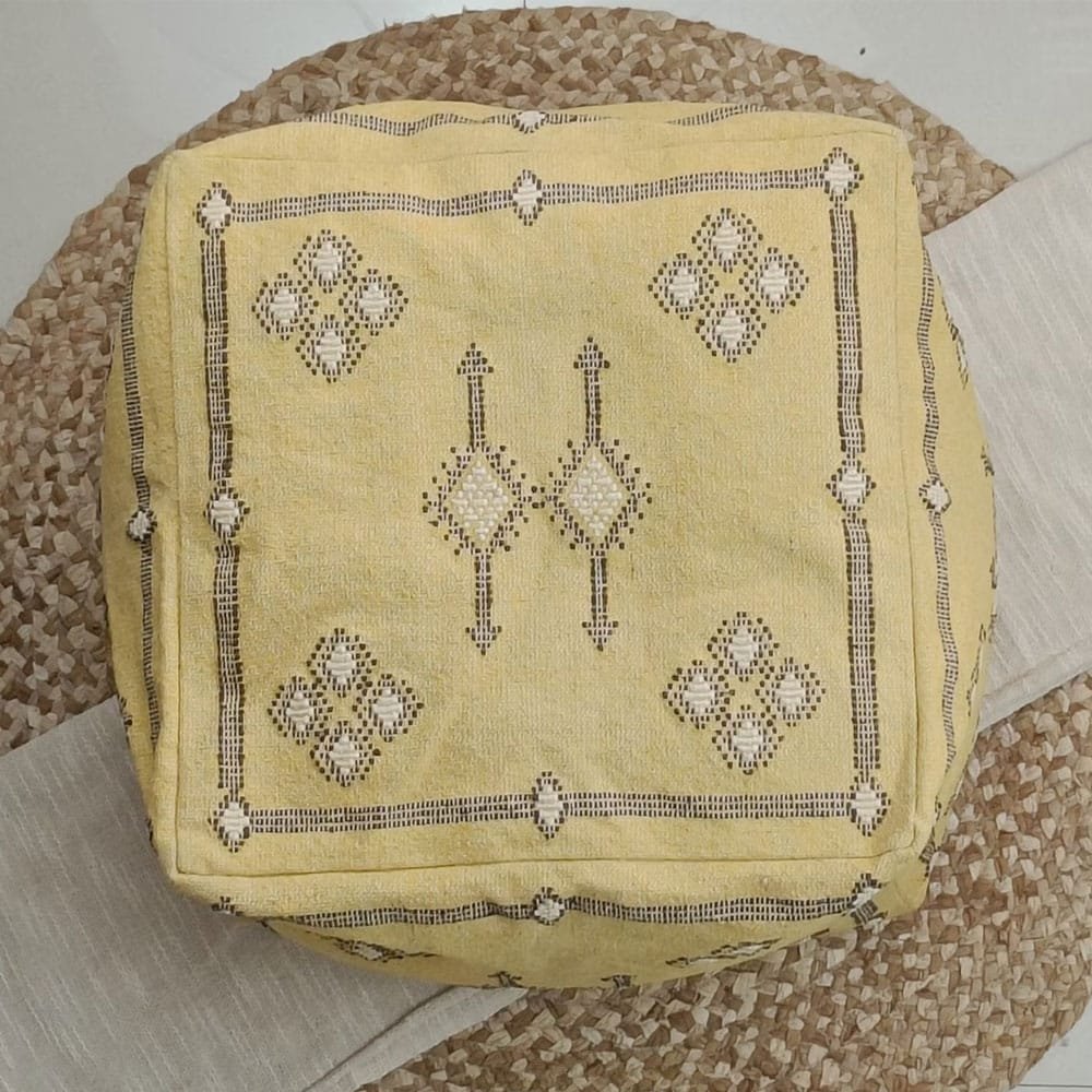 Trasforma la tua casa con il Pouf Kilim marocchino giallo, un pezzo straordinario tessuto a mano in cotone al 100%. Ispirato al fascino esotico della seta di cactus marocchina, il suo design geometrico aggiunge un tocco di fascino nordafricano. Perfetto come seduta, poggiapiedi o tavolino, unisce senza sforzo l’arte culturale alla funzionalità moderna.