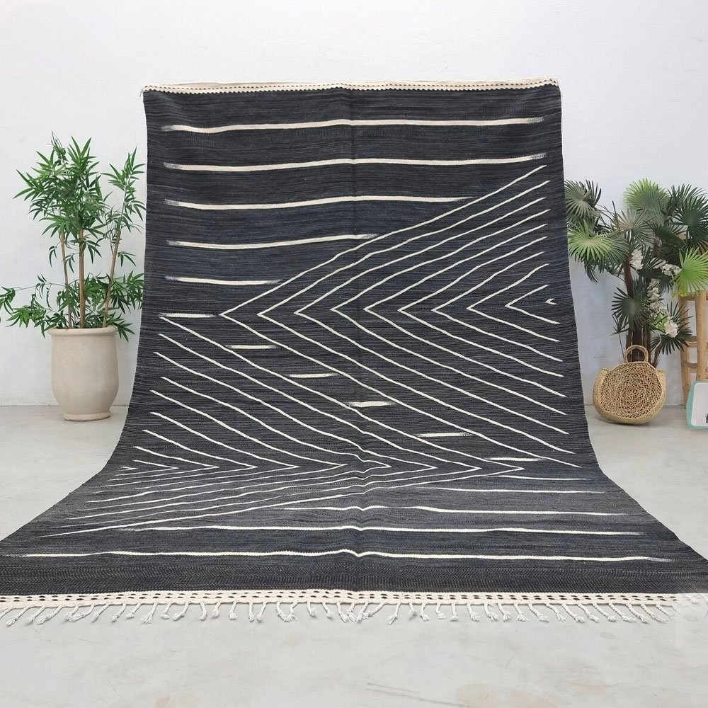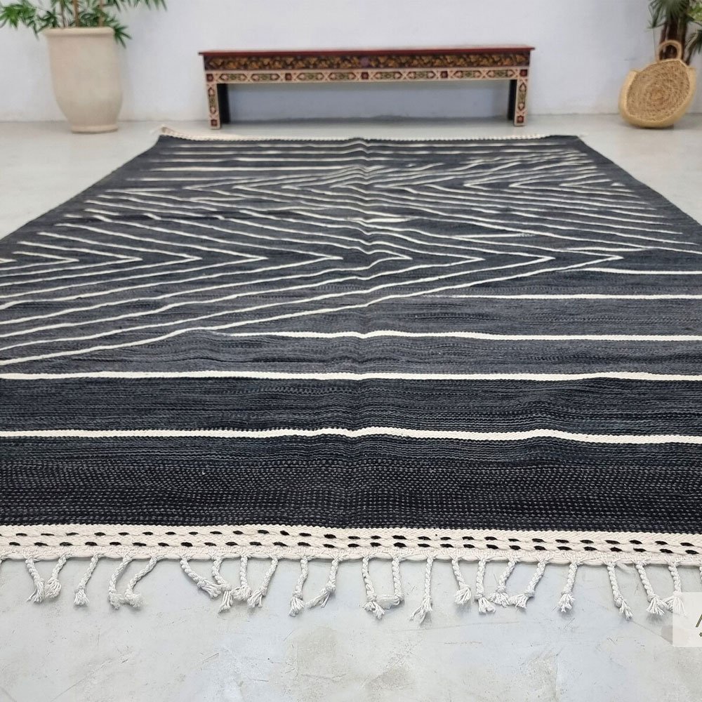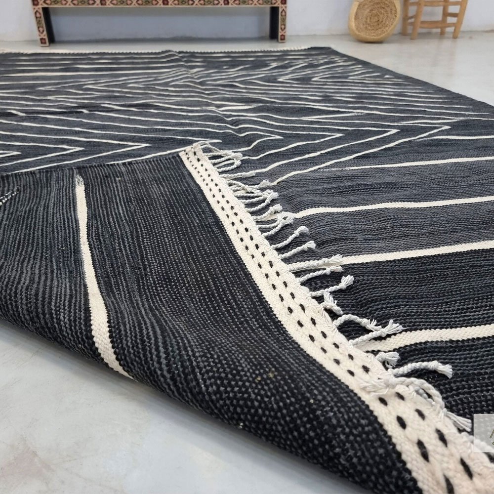 Trasforma la tua casa con il tappeto berbero Black Kilim Flatweave, un capolavoro della tribù Zanafi. Tessuto a mano con disegni intricati, questo tappeto fonde perfettamente il fascino mediterraneo con l’eleganza moderna. La sua arte unica e l’artigianato di qualità superiore lo rendono un pezzo unico, perfetto per aggiungere calore e raffinatezza a qualsiasi ambiente.